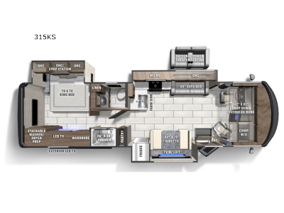 You'll love the beautifully appointed kitchen with tile backsplash and stainless steel appliances, and the private bedroom includes an impressive king-size bed and designer headboard for all-around comfort. A 10" touchscreen radio and reclining/swivel captain's seats make the drive smoother than ever, along with cruise control, traction control, and a tilt and telescoping steering wheel. Head outdoors to find a full basement with a pass-through storage, a power patio awning, automatic leveling jacks, plus many more convenient features.