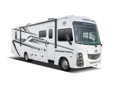 These Forest River Georgetown 3 Series Class A gas motorhomes have been engineered for the road and designed for the driver! Their construction consists of a multi-layered laminated roof system that includes aluminum framing, a crowned fiberglass roof, and block foam insulation. The vacuum bonded gel coated sidewalls, the front cockpit steel structure system and the steel firewall are sure to help with durability and stability. With a hydraulic 4-point leveling system, you can be sure your unit will stay level everywhere you set up. The MORryde 1 1/2" steel truss upfit chassis will hold your unit together for years of fun. A few key features you will appreciate having include a 360 Plus Winegard WiFi to stay connected, a Sony 10" entertainment system to play your favorite tunes, and an exterior solar panel with a controller for off-grid capabilities. Come find your favorite one today!