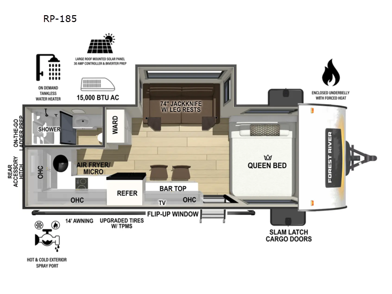 With any R-Pod travel trailer by Forest River, you will enjoy affordable luxury at the lowest tow weight in its class! There is a sealed underbelly with forced heat, a curved dual-pane acrylic front window with a bug screen and night shade, plus a large roof mounted solar panel for off-grid capabilities. The 15K A/C unit will keep you comfortable during the summer camping months, and the tankless water heater will provide endless hot showers after hiking, biking, swimming and more! Each model also includes a black glass friction hinge entrance door, roof ladder prep, exterior motion lighting, plus a hot and cold exterior spray port to wash off sand from the beach. Inside, you'll enjoy seamless Surf-X kitchen countertops, blackout roller shades, and a central vacuum system for hassle-free cleaning!