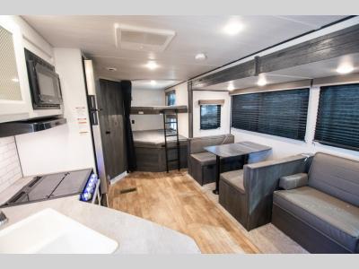 The sharp automotive-inspired exterior design and light, airy interiors will set the stage for carefree camping. Full bath and kitchen amenities comes standard, along with cozy sleeping space, and plenty of storage space for your belongings. Some of the exclusive features that Keystone offers are the color-coded unified wiring, the Tuf-Lok thermoplastic duct joiners, the in-floor heating ducts, and I-bean frame with stamped cross-members and outriggers for added support.