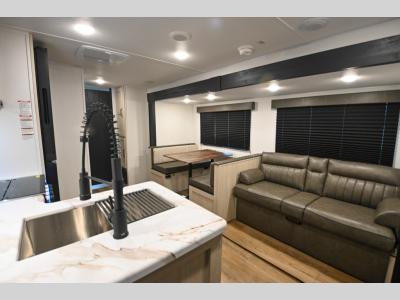 If you're looking for more space, this double axle, double slide out unit is perfect for your group of eight. Within the large slide in the living room, you'll find the booth dinette and sofa, which sit across from the optional TV if you want to enjoy movie nights. The full kitchen includes a stainless microwave and three burner cooktop to make meals, plus a pantry and 12V refrigerator for food storage. And an optional outside kitchen with a griddle can be added if you enjoy cooking outdoors! Your guests or littles are sure to enjoy the rear private bunkhouse that features a set of 38" x 76" bunks across from the third bunk and jiffy sofa within a slide out!