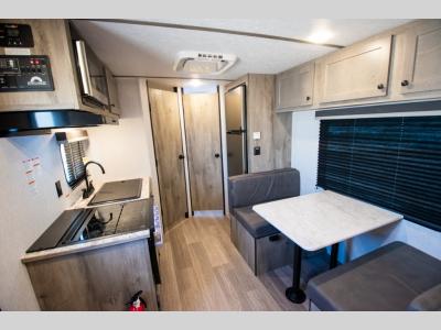 The perfect family-friendly travel trailer is found with this Sun Lite LTD model. You can take the front bed each night, while your guests or little ones take the double-size bunks towards the back. And if you're not needing the additional sleeping space, you can choose the desk option in place of the bunks. There is also a full bath right next to the bunks for easy nighttime use. The chef of your group can make meals using the three burner cooktop, and there is a double bowl sink for easy clean up. Once dinner has been cleaned up, you can play a game at the booth dinette, or head outdoors for an evening walk around the campground!