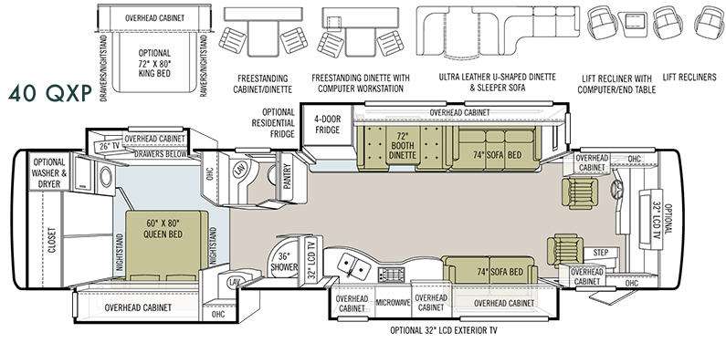 LCD TV Seven-foot ceilings Ultra Leather DE sofa bed on passenger's side Cloth DE sofa bed on driver's side Booth dinette with large pull-out storage drawers Home theater surround sound system with DVD player Double bowl kitchen sink 2-burner glass cooktop Stainless steel convection microwave with exterior venting