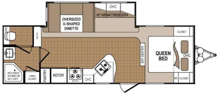 Single Slide Denali Travel Trailer by Dutchmen w/Rear Full Bath w/Neo-Angle Shower, Linen Closet, Lav., Private Toilet Area, Pantry, Oversized U-Shaped Dinette & 62" Air Mattress Sofa Slide, Pantry, Refrig., 3 Burner Range, Dbl. Kitchen Sink, Entertainment Center, Front Queen Bed w/Closets Both Sides of Bed w/One Shirt Closet Also, Pass-Thru Storage Plus and Much More!