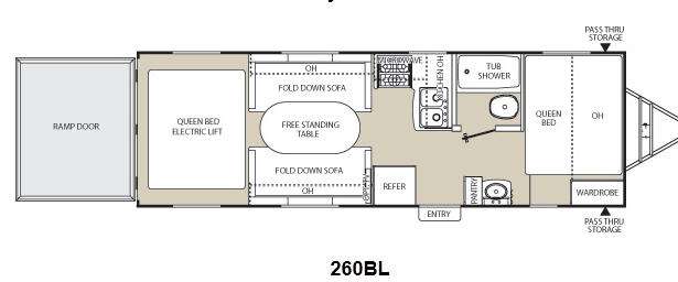 Aerodynamic Front Profile Dual 20 lb.LP bottles LP Bottle Cover w/Valve Access 60 degree A-frame Dual Battery Rack Insulated and Painted Radius Entry Door w/Clear View Slider on Screen Amber Patio Light Double Entry Step Nitrogen Filled Radial Tires 3M Digitally Printed, Breathable Graphics Black Framed, Tinted, Safety Glass Windows Marine Grade Exterior Speakers Lighted Expanded Pass-through Storage (Most models) Winterization Kit 30 Amp Power Cord with Storage Compartment Heavy Duty Welded Safety Chains Four-Wheel Electric Brakes Breakaway Safety Cable Exterior GFI Outlet Near Awning High-Capacity Roto-Cast Holding and Fresh Water Tanks HappiJac Double Hat Rail, Rack & Pinion 12V Slide System (18" slides) Powder E-Coated Welded I-Beam Frame with Full Width Outriggers Alumicage Welded Aluminum Structure, Vacuum Bonded Floor and Sidewalls Smooth Fiberglass Exterior Skin Aluminum Framed Openings Powder E-Coated Steps and Axles Floorplan Specific Cambered Frame Design Full Walk-on, Crowned, Aluminum Reinforced Roof with EPDM Membrane over 3/8" Roof Decking Double Wiper Seals on All Slideouts Azdel Composite (IPO lauan behind fiberglass)