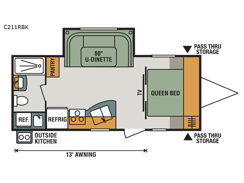 There is plenty of overhead cabinets throughout as well as an exterior pass through storage area, and a 13' awning for shade.