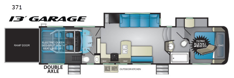 Come load up a few off-road toys, your family, and your camping gear and head on out to your favorite campground with this Torque toy hauler. In the 13' separate garage you can easily store a few dirt bikes or an ATV. Your kids will enjoy the loft above the garage, and below there is a convenient half bathroom near the garage side door. Once you are done playing on the trails, then come back and easily fix a snack or your evening meal in the outdoor kitchen which features a two-burner range and a sink.
